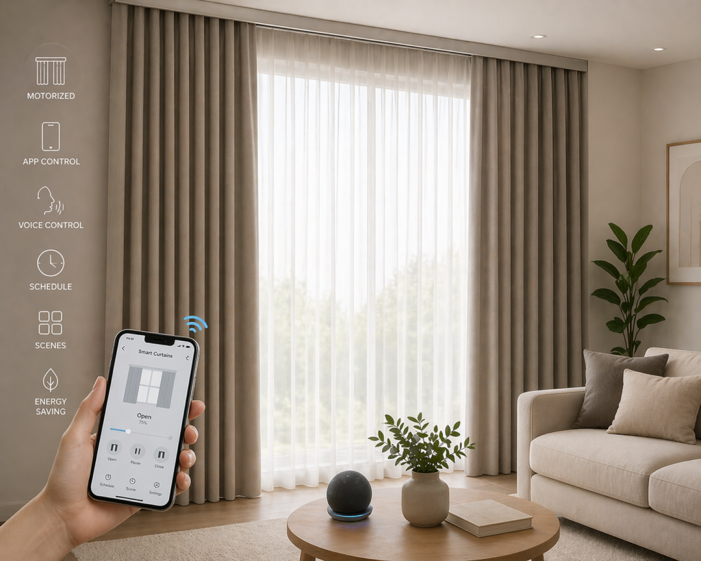 Motorized curtains with remote or app control, bringing comfort, convenience, and luxury to your home.